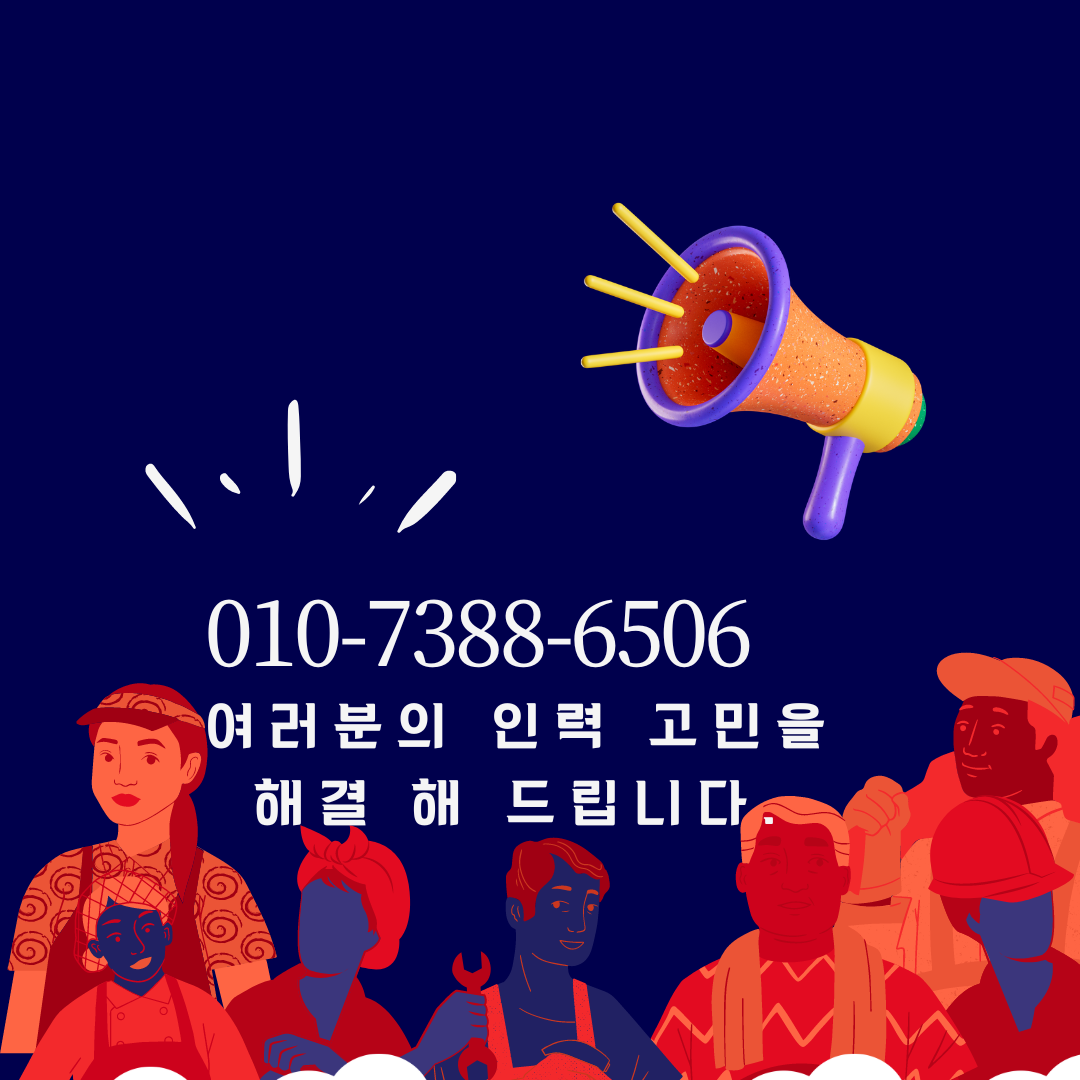 안녕하세요 대표님!!! 저희는 숙련된 외국 인력을 신속하고 효율적으로 제공하여 귀사의 인력 문제를 해결해드립니다. 믿을 수 있는 파트너로서, 귀사의 성공에 기여하고 싶습니다. 문의사항이 있으시면 언제든지 연락주세요. 010-7388-6506 박여훈 입니다.